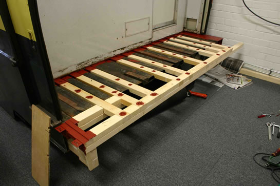 Het eindresultaat. Als afwerking is een aluminium strip aangebracht tussen de wand van de bestuurderscabine en de vloer. Merk ook de verlenging van de deurgoot op.